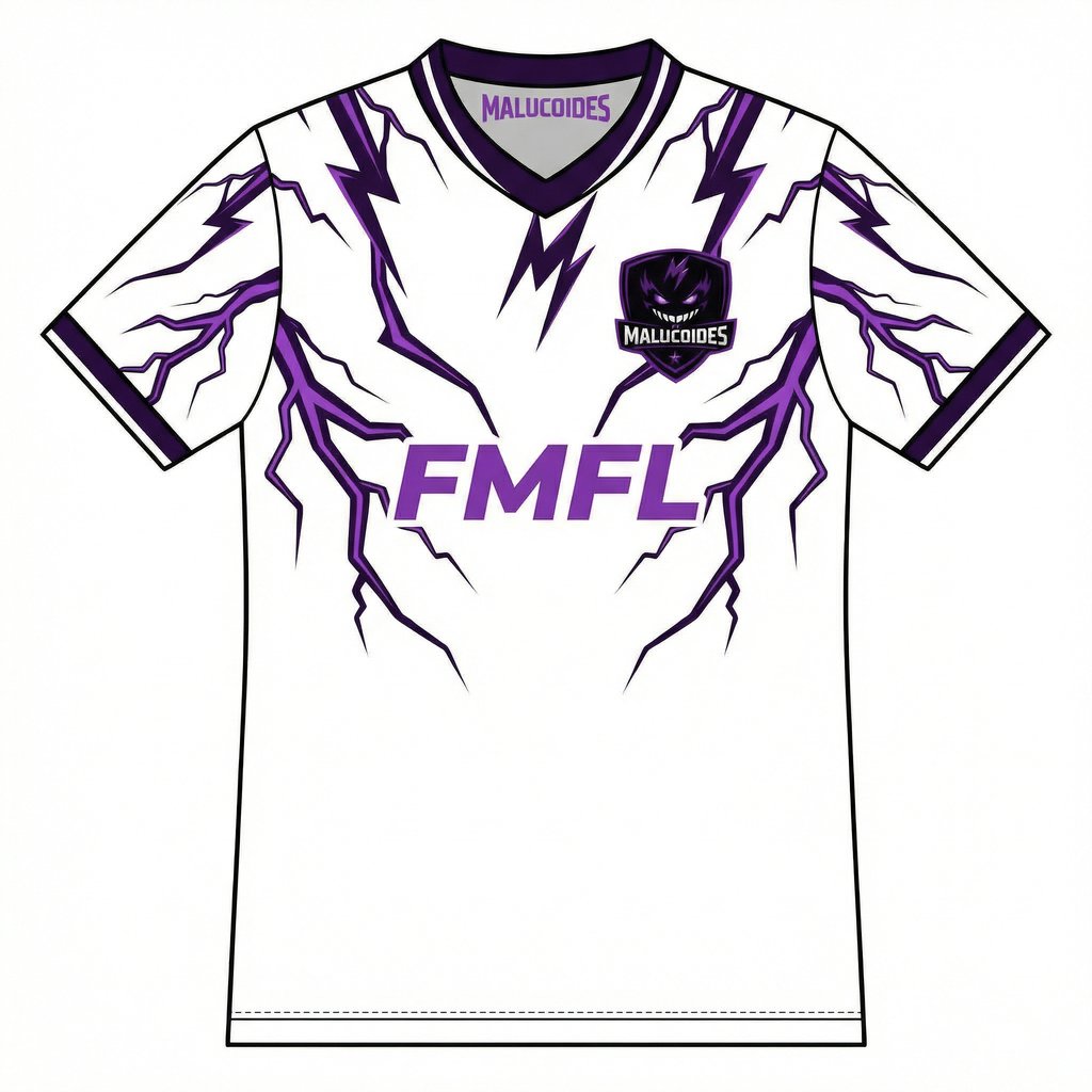 O equipamento secundário do FC Malucoides chegou! Base branca, rasgada por raios roxos, mostrando que a loucura não muda… só se adapta.