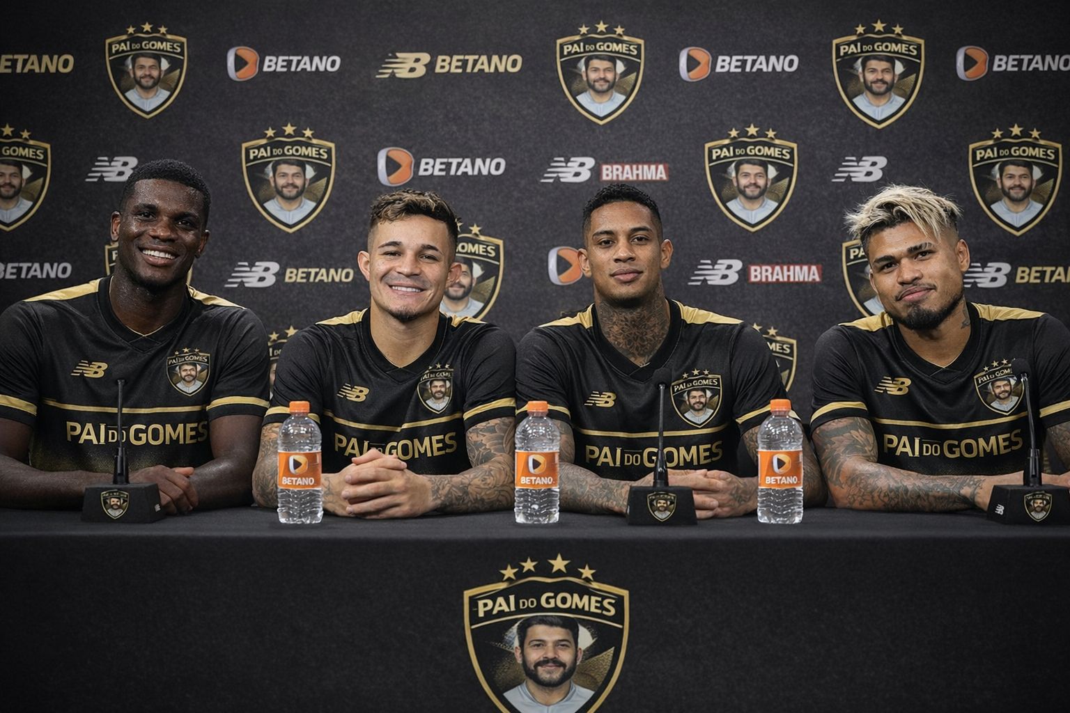 O Pai do Gomes segue pesado no mercado e apresenta, de uma só vez, quatro reforços de impacto que chegam para elevar o nível do elenco e dar trabalho aos adversários. Da esquerda para a direita, conheça os novos donos da camisa preta e dourada: