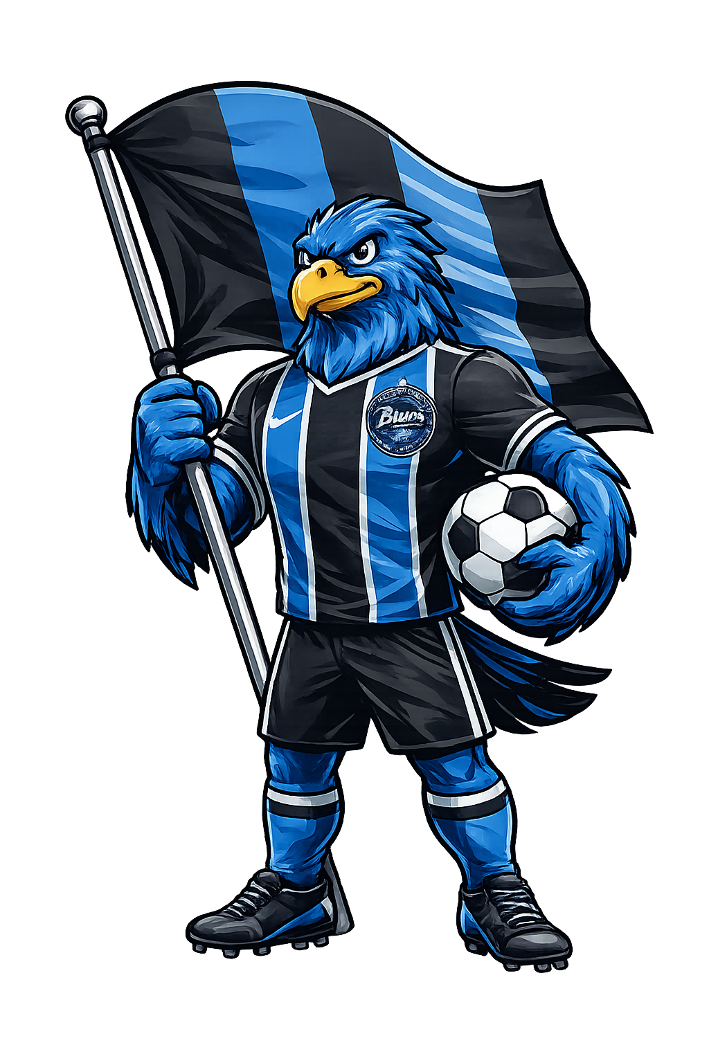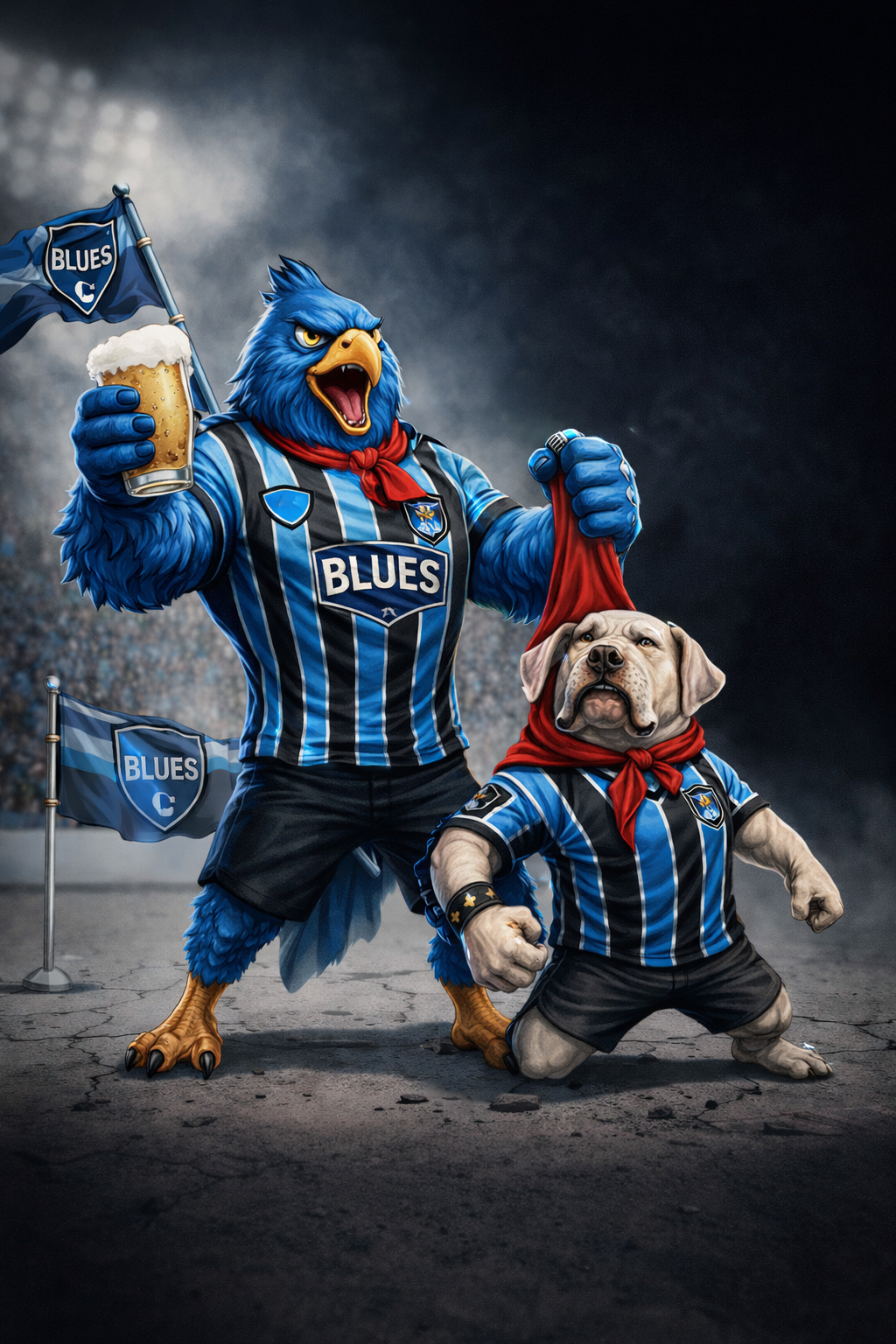 Carregando a bandeira do Blues e a bola do jogo, ele traduz o espírito do torcedor: alguém que empurra o time, protege sua casa e nunca abandona a arquibancada. Mais do que força, ele representa união — porque no Blues ninguém luta sozinho.