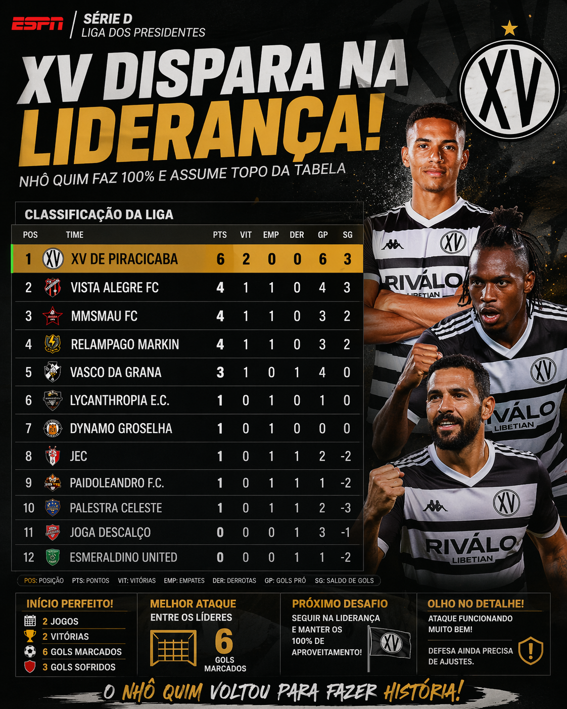O XV de Piracicaba começou com tudo na Série D da Liga dos Presidentes e já assume a liderança isolada! 💪⚫⚪