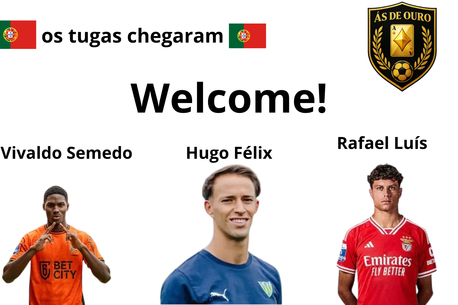 O Ás de Ouro anuncia Vivaldo Semedo (atacante), Hugo Félix (meia) e Rafael Luís (volante) como novos reforços do elenco.