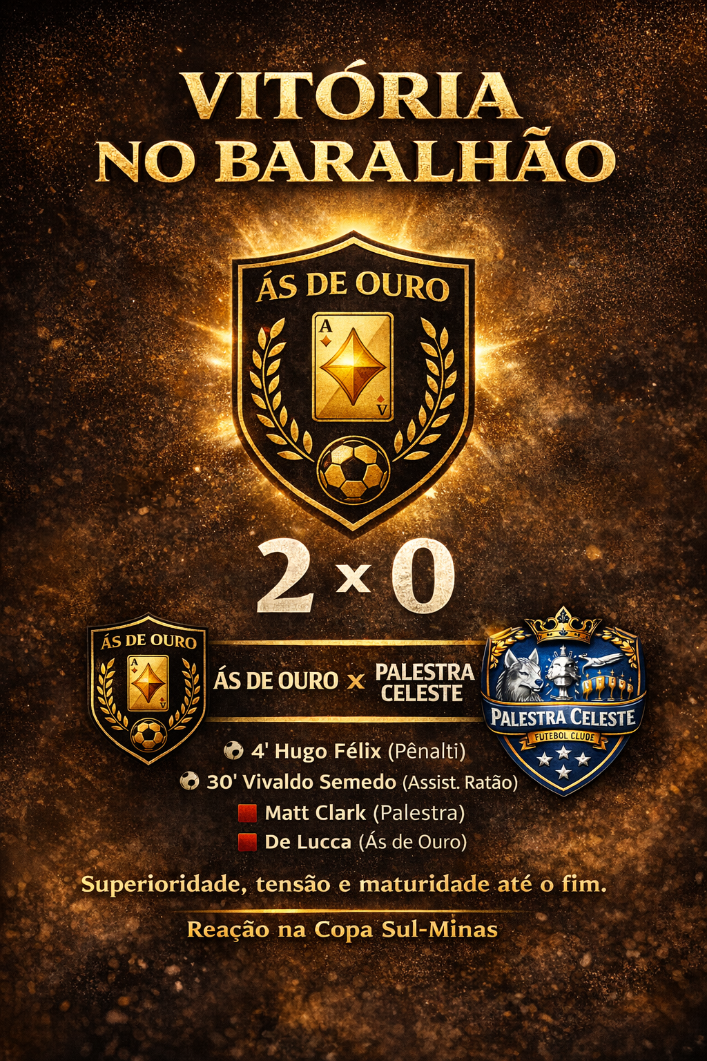 Assim, o Ás de Ouro encerra sua participação com uma vitória diante da torcida e com sinais de que a parceria entre Ratão e Hugo Félix pode ser uma arma importante para o futuro da equipe. 🃏⚽