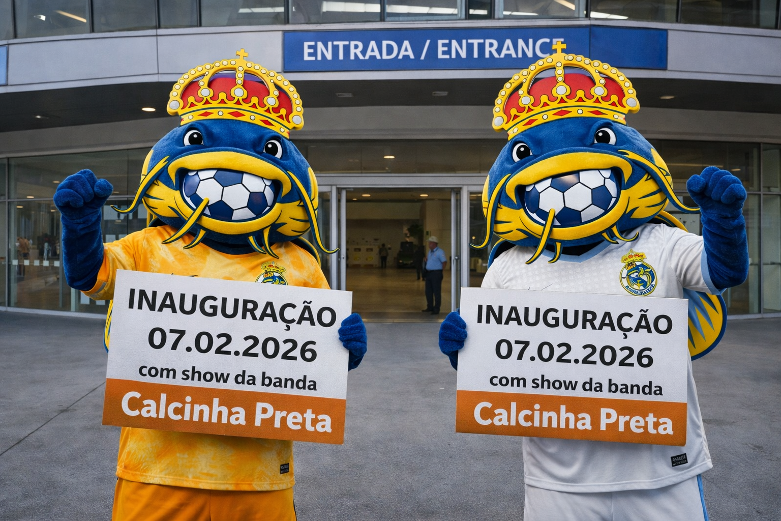 Mascotes anunciam inauguração histórica do estádio em 07/02/2026, com Calcinha Preta no comando da festa e promessa de casa cheia desde o primeiro minuto.