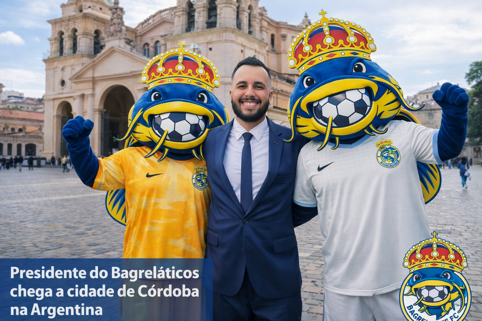 Às sombras da antiga catedral e sob o olhar atento das coroas que simbolizam grandeza, o Presidente do Bagreláticos surge em solo argentino. Sorriso no rosto, postura firme… mas intenções ainda guardadas a sete chaves.